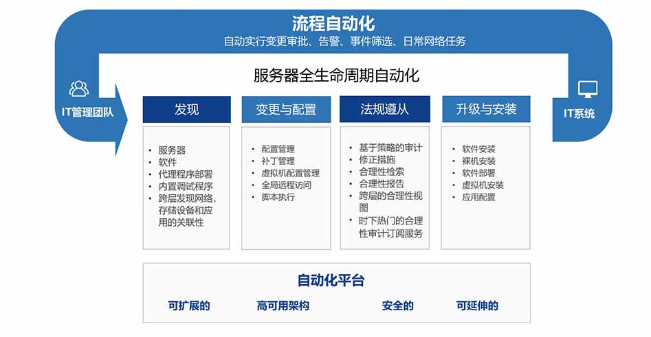 从资产发现到软件安装,从补丁分发到配置管理,从脚本执行到合规审计,惠普服务器自动化软件能对企业与服务器的整个生命周期进行管理。惠普服务器自动化软件实现跨团队和系统的运维与流程的自动化。